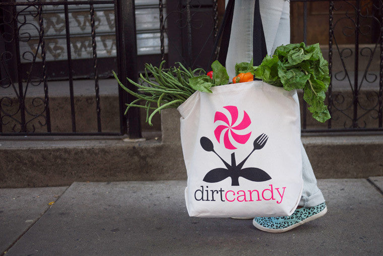 Made of 100% recycled cotton, the Dirt Candy tote bag will eliminate plastic bags from your life. As we all know, plastic bags from the supermarket clutter up your cabinets, drink all your beer and slip into your bedroom at night and try to suffocate you. Plastic bags are the problem! The Dirt Candy tote bag is the solution! Infinitely reusable, unreasonably attractive, it's the recycled cotton tote bag that tells everyone else at the store that you are the captain of your own ship, you are the master of your own destiny! Sturdy, reliable, and trustworthy, the Dirt Candy tote bag is the perfect solution for people who've decided that they're sick and tired of lugging around crinkly, unsightly plastic bags. Vegetables not included.